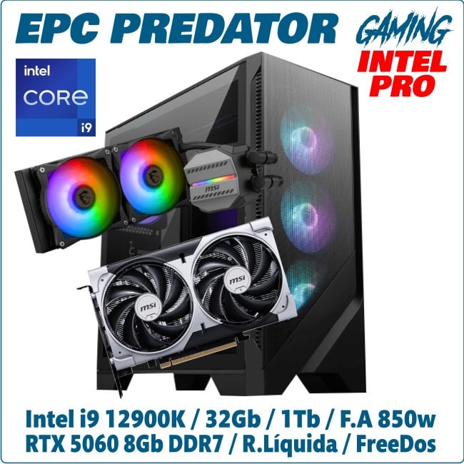 Ordenador ePc Predator Gaming Intel Pro Intel i9-12900K 32GB DDR5 RAM 1TB SSD NVMe NVIDIA RTX5060 8GB Refrigeración Líquida ARGB Caja Torre ARGB F.A 850W FreeDos